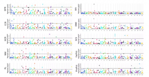 在牛的CNV變異研究中,利用已發(fā)表的1,116個牛中的鑒定的25,030個CNVs,基于不同性狀(功能、健康、繁殖等)的CNVs進行GWAS,并評估其對養(yǎng)殖和育種實踐的影響,結果顯示,共有56個CNVs與8個表型性狀中的一個或多個顯著相關,其中12號染色體上的3個CNVs與產(chǎn)脂性狀和乳腺性狀的顯著關聯(lián),這些CNVs位于23個不同的基因上,該研究是首次對如此大的瑞士奶牛樣本進行基因組分析,將CNVs與繁殖、乳腺和健康性狀聯(lián)系起來。同樣,基于在528個荷斯坦奶牛中鑒定的197個CNVs(圖4),對473頭牛10個重要生產(chǎn)性狀進行GWAS分析,共檢測到57個CNVs與至少一個性狀顯著相關(圖5),對這些CNVs與候選基因的潛在重疊進行分析,預測得到一些表型相關的候選基因,該研究結果對荷斯坦奶牛的基因組鑒定了CNV,并提供了影響飼料效率和采食相關性狀變異的候選基因。