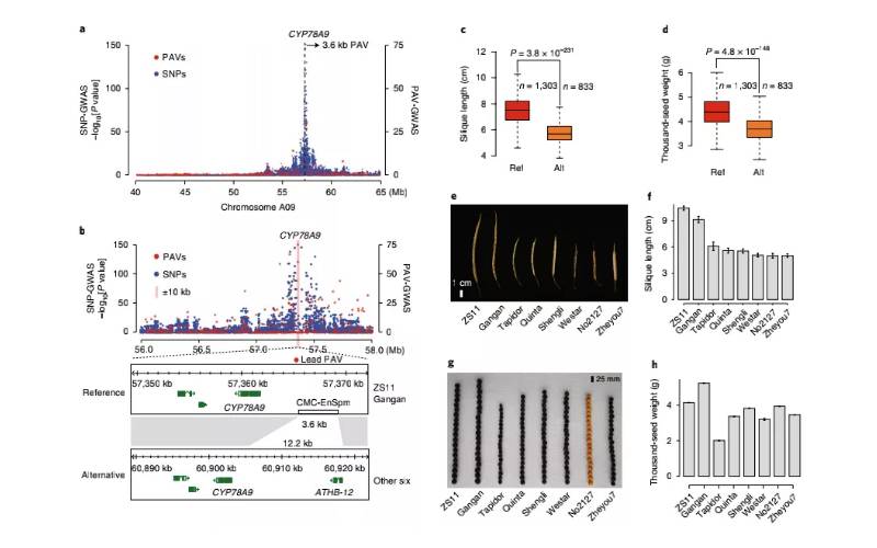 (2)在除水稻以外的作物中也有使用SVs進行GWAS的報道。例如,在玉米中,521個自交系玉米基因組序列中的SVs被用于繪制玉米SV圖譜;在小麥中發(fā)現(xiàn)了影響染色體3B上基因和轉座元件的SV;在最近的一項木瓜研究中(使用栽培木瓜和野生木瓜),共鑒定出8083個SVs,其中包括5260個缺失,552個串聯(lián)重復和2271個插入,在該研究中,還發(fā)現(xiàn)CNVs與生長和對環(huán)境壓力的反應有關;在油菜中,基于鑒定得到的數(shù)百萬SVs和PAVs用于PAV-GWAS,直接鑒定到了莢果長度、種子重量和開花時間相關的結構變異,這些是之前基于單核苷酸變異SNP進行的GWAS所沒能鑒定出來的,充分說明了PAV-GWAS可以互補于SNP-GWAS用來鑒定特定性狀相關的位點(圖7);另外,其他植物SVs鑒定例子包括:溝酸漿屬的耐鹽性、葡萄的漿果顏色和番茄的馴化性狀等研究。