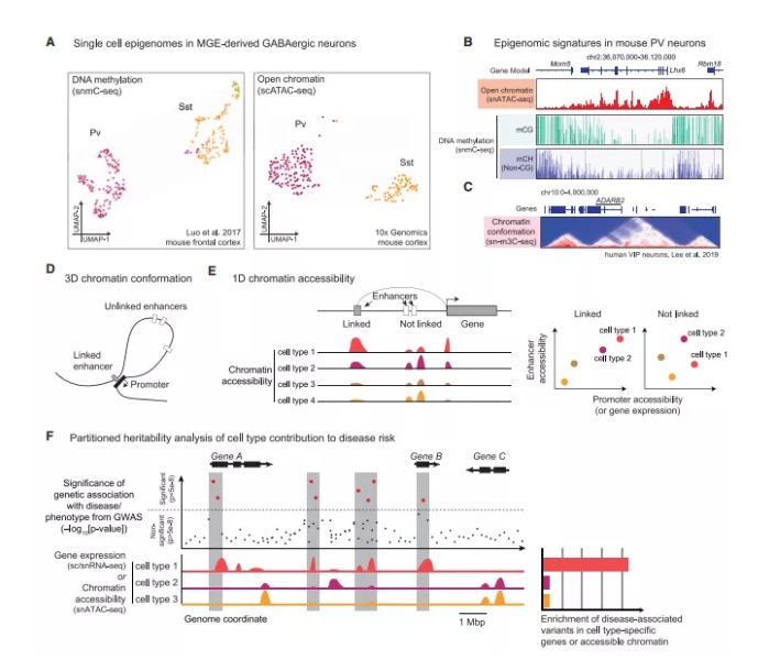盡管全基因組關(guān)聯(lián)研究(GWASs)已經(jīng)確定了一些神經(jīng)和精神疾病的風(fēng)險(xiǎn)位點(diǎn),但每種疾病中特定腦細(xì)胞類型的脆弱性在很大程度上仍是未知的。通過(guò)細(xì)胞類型特異性轉(zhuǎn)錄組或表觀基因組的遺傳分析可以識(shí)別活躍基因在GWAS風(fēng)險(xiǎn)位點(diǎn)附近富集的細(xì)胞類型,表明其在疾病中可能具有直接或間接的作用(圖3F)。