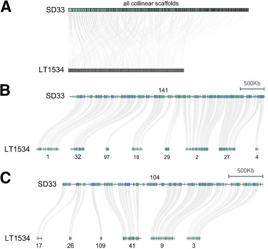 圖2.P. capsiciSD33和LT1534之間的基因組同線(xiàn)性