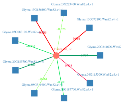 典型相關(guān)分析(canonical correlation analysis, CCA),是利用綜合變量對(duì)之間的相關(guān)關(guān)系來(lái)反映兩組指標(biāo)之間的整體相關(guān)性的多元統(tǒng)計(jì)分析方法。對(duì)相關(guān)性網(wǎng)絡(luò)圖中的差異基因及差異代謝物進(jìn)行典型相關(guān)分析,圖中以十字區(qū)分出四個(gè)區(qū)域,在同一個(gè)區(qū)域內(nèi),距原點(diǎn)越遠(yuǎn)關(guān)聯(lián)性越高,在同一個(gè)象限內(nèi)距離較近的代謝物和基因之間相關(guān)聯(lián)的程度高,基于此結(jié)果可進(jìn)一步挖掘和代謝物最相關(guān)的基因。