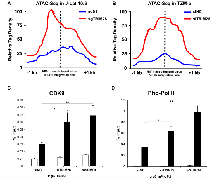 其中,作者通過ATAC-Seq探究了TRIM28缺失后HIV-1啟動子的染色質(zhì)可及性,發(fā)現(xiàn)啟動子區(qū)的活性顯著增強,最終說明了RIM28介導的SUMO化損害了CDK9與Cyclin T1的結合能力和CDK9對RNAP II的激酶活性,導致轉錄延伸功能障礙。