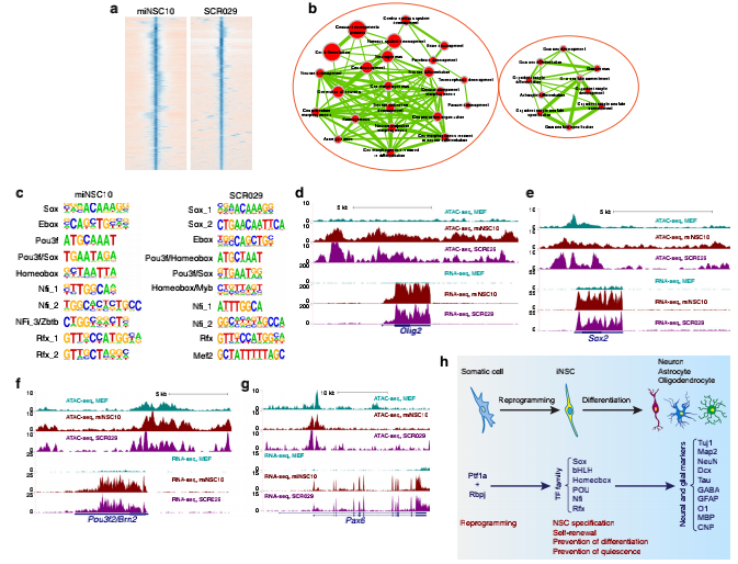 由體細胞重編程的誘導性神經(jīng)干細胞(induced neural stem cells,iNSC)在神經(jīng)疾病的細胞替代療法和體外建模中具有巨大的潛力。已有研究證明將成纖維細胞直接轉化成iNSC的方法依賴于幾個關鍵的神經(jīng)前體細胞轉錄因子(TF),這就提出了一個問題:這種直接的重編程是否可以由非神經(jīng)前體細胞調(diào)控TF來實現(xiàn)。通過RNA-seq和ATAC-seq分析結果,作者發(fā)現(xiàn)非神經(jīng)前體細胞調(diào)控TFPtf1a可以將小鼠和人的成纖維細胞直接重編程為具有分化出神經(jīng)元、星形膠質(zhì)細胞和少突膠質(zhì)細胞的潛能和自我更新能力的iNSC,并在移植后可以改善阿爾茨海默病小鼠模型的認知功能障礙。相比于MEF,miNSC10和SCR029細胞,Ptf1a重編程的miNSC自我更新和維持所需要的Notch信號通路相關基因均顯著上調(diào),并且這些位點也顯示出差異的ATAC-seq圖譜。說明Ptf1a的重編程活性是通過與Rbpj結合的非Notch信號依賴途徑,來維持NSC特化、自我更新和體內(nèi)穩(wěn)態(tài)。同時作者的數(shù)據(jù)確定了這是一種用于研究和治療的更安全的非典型iNSC。
