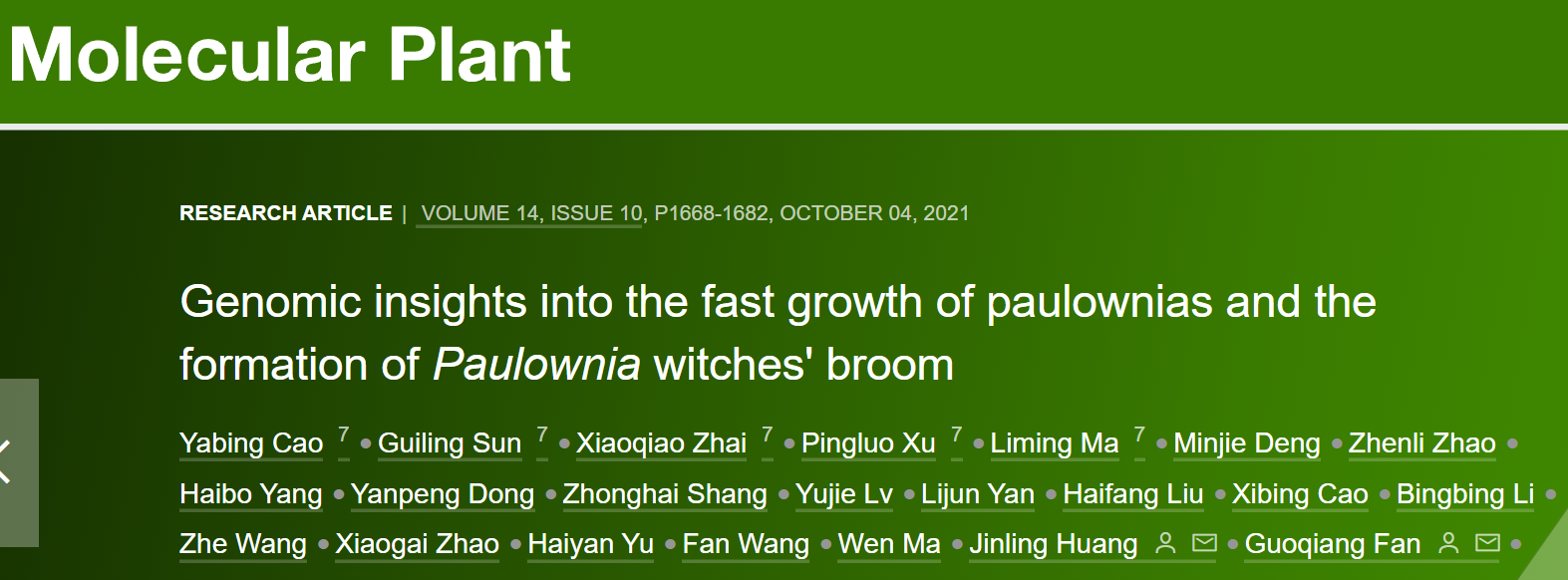 本研究通過(guò)PacBio技術(shù)組裝完成511.6 Mb泡桐基因組,contigN50=852.4 Kb;并通過(guò)Hi-C技術(shù)將93.2%序列錨定至20條假染色體上,多種評(píng)估結(jié)果表明本次構(gòu)建了高質(zhì)量染色體水平的白花泡桐基因組。研究進(jìn)一步基于白花泡桐及其叢枝植原體基因組測(cè)序和進(jìn)化分析,揭示了C3光合作用與景天酸代謝相結(jié)合提高光合效率的方式,是白花泡桐快速生長(zhǎng)的關(guān)鍵因素。并通過(guò)WGCNA、轉(zhuǎn)基因、酵母雙雜交、雙分子熒光互補(bǔ)和免疫共沉淀等方式,闡明了泡桐叢枝植原體效應(yīng)因子PaWB-SAP54介導(dǎo)的PfSPLa泛素化引起了泡桐叢枝病的形成。該研究為加速泡桐的分子育種、品種改良及進(jìn)一步闡明泡桐叢枝病發(fā)生分子機(jī)制奠定了堅(jiān)實(shí)基礎(chǔ)。