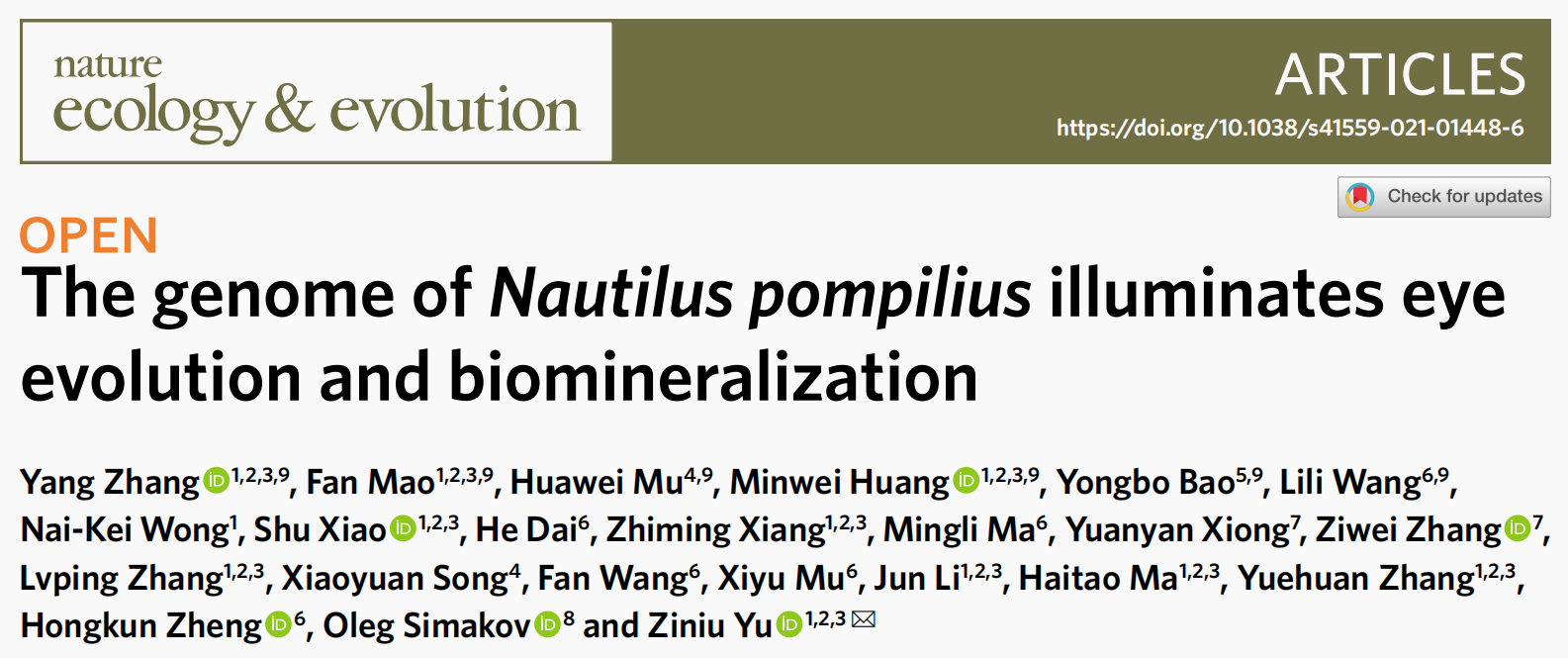 本研究基于PacBio平臺(tái)組裝了被測(cè)序的頭足類(lèi)動(dòng)物中基因組*小的物種-鸚鵡螺基因組,其組裝大小為730.58 Mb,contigN50=1.1Mb,BUSCO評(píng)估為91.31%。通過(guò)鸚鵡螺基因組測(cè)序和進(jìn)化分析,揭示了針孔眼形成和生物礦化的演變規(guī)律,并結(jié)合轉(zhuǎn)錄組、蛋白組、基因家族及系統(tǒng)發(fā)育等分析對(duì)針孔眼、殼形成機(jī)制進(jìn)行了深入剖析。研究表明Hox簇完整性的破壞可能與軟體動(dòng)物譜系中外殼的進(jìn)化丟失有關(guān)。鸚鵡螺基因組中晶狀體發(fā)育的關(guān)鍵轉(zhuǎn)錄因子NRL/Maf的缺失和晶狀體形成蛋白的基因家族收縮,共同促進(jìn)了鸚鵡螺針孔眼的形成。相關(guān)的研究成果對(duì)鸚鵡螺的生物學(xué)研究、遺傳資源保護(hù)以及頭足動(dòng)物的適應(yīng)性演化都將發(fā)揮重要的推動(dòng)作用。