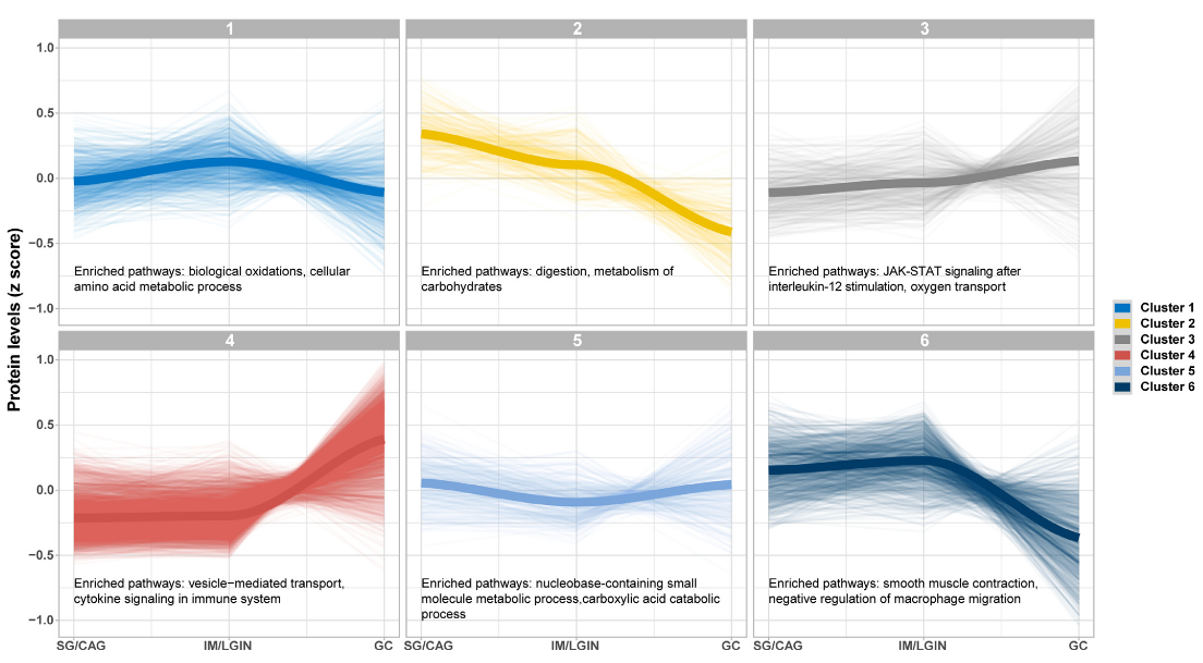 對三個預(yù)選定的受試者組進行了蛋白質(zhì)組學(xué)數(shù)據(jù)的無監(jiān)督聚類分析:即輕度胃病變 (SG/CAG)、晚期胃病變 (IM/LGIN) 和胃癌(GC),揭示了從胃病變到 GC的不同特征。然后沿著胃病變進展的級聯(lián)探索了詳細的蛋白質(zhì)表達模式,并提取了 6 個具有相似軌跡的蛋白質(zhì)簇,展示了蛋白質(zhì)組學(xué)譜的從輕度胃病變、晚期胃病變至GC的動態(tài)變化。