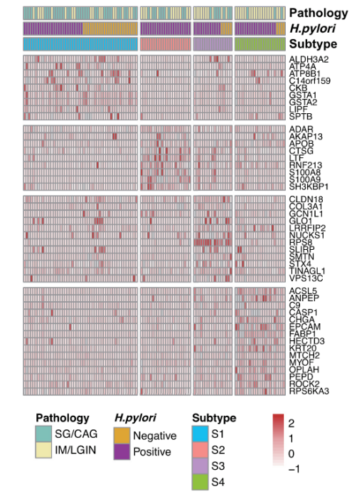 其后文章中討論了超出細胞形態(tài)水平的胃病變(SG、CAG、IM 或 LGIN)的分子相似性和異質(zhì)性。基于在超過 3/4 的胃病變受試者中檢測到的前 100 種變異最大的蛋白質(zhì),通過NMF算法得出胃病變的 4 個分子亞型(S1-S4)。發(fā)現(xiàn)分子亞型與病理診斷的嚴重程度之間存在顯著相關(guān)性,亞型 S1 代表蛋白質(zhì)組學(xué)定義的輕度胃病變,S4 代表最嚴重的胃病變。