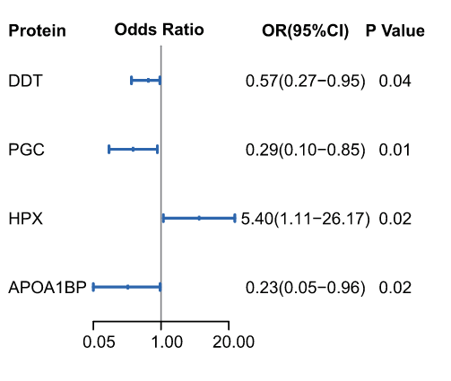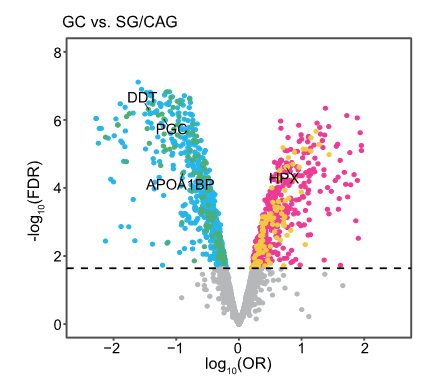 通過對驗證集中受試者的前瞻性隨訪,考查了上文詳述的217種蛋白質(zhì)與胃病變進展風險之間的關(guān)聯(lián)。其中的四種蛋白質(zhì),即 APOA1BP、PGC、HPX 和 DDT,進一步與胃病變進展風險和隨訪終點發(fā)生IM或更嚴重胃病變的風險顯示出相關(guān)(P < 0.05,邏輯回歸分析)。HPX與早期GC和胃病變進展呈正相關(guān),而 APOA1BP、PGC 和 DDT 呈負相關(guān)。這四種突出顯示的蛋白質(zhì)分別聚集在蛋白簇-2 (PGC)、-4 (HPX)、-5 (APOA1BP) 和 -6 (DDT) 中。