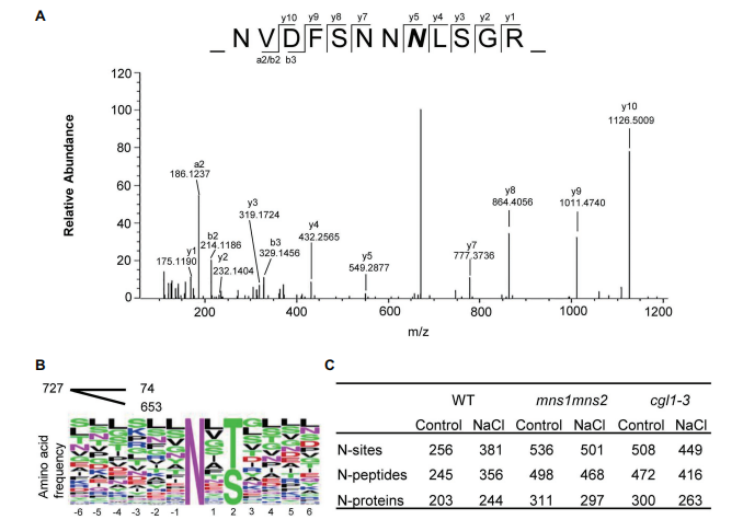 許多證據(jù)表明,植物對鹽脅迫的適應性反應需要相關蛋白上加工成熟的N-聚糖參與。然而,關于在這個過程中起作用的鹽響應糖蛋白知之甚少。本研究鑒定了野生型?(WT)擬南芥中的鹽響應糖蛋白和兩個N-聚糖成熟缺陷的突變體mns1?mns2和cgl1。通過液相色譜串聯(lián)質譜?(LC-MS/MS)?進行定量分析,共鑒定出97種豐度變化?>?1.5?的蛋白質對抗鹽脅迫。表明N-聚糖對于調節(jié)應激反應蛋白水平至關重要,并且列出了幾種負責擬南芥耐鹽脅迫的新型糖蛋白。
