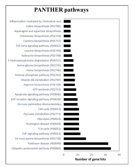 統(tǒng)計分析后,作者進行基于基因本體(GO)的功能分類,在2102種蛋白質中,PANTHER?19.0?針對Helianthus?annus數(shù)據(jù)庫檢測到2044種蛋白質。接下來,進行?PANTHER?通路分析以對蛋白質通路進行分類,發(fā)現(xiàn)了大多數(shù)蛋白質歸因于泛素蛋白體和核苷酸(嘌呤)生物合成途徑,其次是TCA循環(huán)、糖酵解、丙酮酸代謝、細胞周期和嘧啶核糖核苷酸途徑。