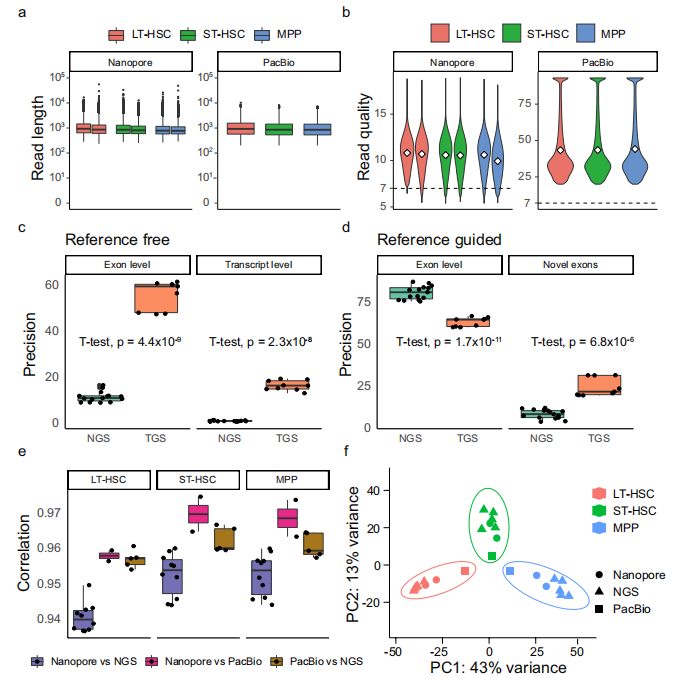 利用短讀長下一代測序(NGS)或長讀長測序(如PacBio和Oxford Nanopore Technologies)的RNA測序,是解讀包括血細胞生成在內(nèi)的各種生物過程中的轉(zhuǎn)錄多樣性和調(diào)控機制的強大工具。雖然NGS在表達定量方面更可靠,但是短讀長在AS事件中只能提供有限的信息。相比之下,長讀長的測序方法提供了一個獨特的機會,可以實現(xiàn)在提供全長信息的基礎(chǔ)上檢測可變剪接異構(gòu)體。本文使用短讀長和長讀長RNA測序,在批量和單細胞水平上對小鼠HSC和MPP進行了全面的轉(zhuǎn)錄圖譜分析。