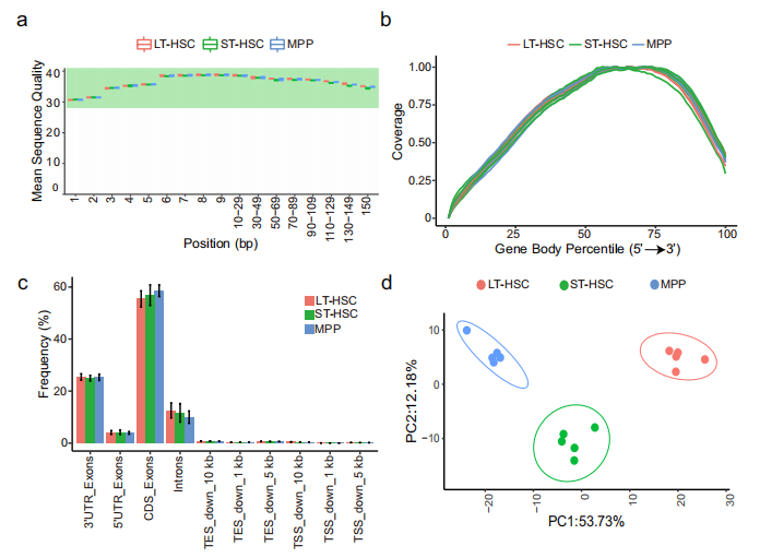 樣本制備:8-9周的雌性成年C57BL/6 J 小鼠,從股骨和脛骨中分離骨髓細胞。首先使用小鼠造血干細胞分離試劑盒富集造血干細胞和祖細胞(HSPC)。長期(LT)和短期(ST)造血干細胞(HSC)和多能祖細胞(MPP)根據(jù)其表面標志物進行分選。對于單細胞RNA測序(scRNA-seq),將細胞單獨分選到含有裂解緩沖液的8條PCR管中。同時對于批量RNA-seq,分選100個細胞(P100)到一個PCR管中作為生物學重復。