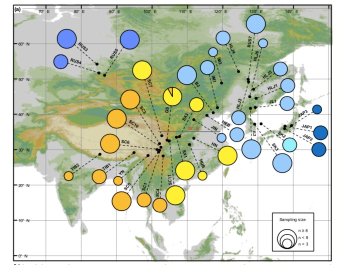 對包括地理距離、環(huán)境、氣候歷史和外部傳播在內(nèi)的潛在驅(qū)動因素分析發(fā)現(xiàn),該復(fù)合群以東亞35°N(即秦-巴山脈以北)為分界線,南北群體在遺傳、形態(tài)和生態(tài)水平上存在明顯差異。群體歷史動態(tài)和分布區(qū)模擬分析表明,由于第四紀氣候的變化,導(dǎo)致了該類群能夠從亞洲東北部向西南部遷移并定居于新的生境。此外,除了生態(tài)適應(yīng)性外,該研究還發(fā)現(xiàn)林冠郁閉度、風向以及生境連續(xù)性都可能限制基因流的影響。這些結(jié)果為蕨類植物時空演化模式的研究提供了新的思路,強調(diào)了生境異質(zhì)性在驅(qū)動遺傳分化對強擴散能力的影響。
