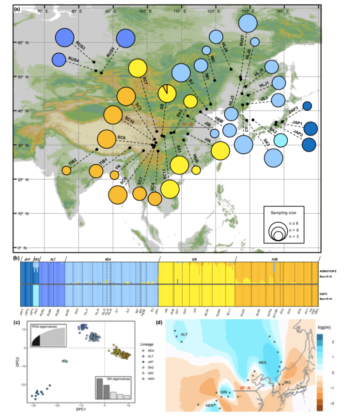 在今年3月份發(fā)表在Molecular Ecology(IF = 6.185)上的題為“Ecological adaptation shaped the genetic structure of homoploid ferns against strong dispersal capacity”的研究中,中國科學(xué)院植物植物研究所張憲春研究組利用SLAF-seq對中華蹄蓋蕨復(fù)合群Athyrium sinense complex進行簡化基因組測序,獲取全基因組范圍內(nèi)有代表性的SNP變異位點,對其群體遺傳結(jié)構(gòu)進行分析,揭示了蕨類植物孢子強擴散能力下生態(tài)適應(yīng)塑造的遺傳分化格局。