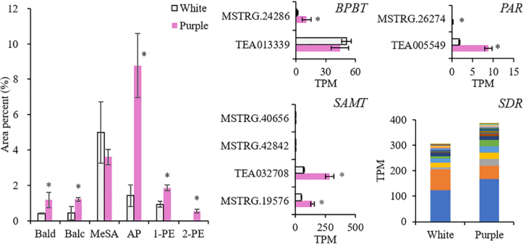 然后,作者研究了四種直接合成苯甲酸芐酯、MeSA、2-PE和AP的基因,分別是苯甲醇鄰苯甲酰轉(zhuǎn)移酶(BPBT;KO id為K19861)、水楊酸羧基甲基轉(zhuǎn)移酶(SAMT;KO id為K21483)、苯乙醛還原酶(PAR)和短鏈脫氫酶/還原酶(SDR)。他們都在紫色茶花中高表達(dá)。通過柱狀圖分析了兩個品種之間存在顯著差異的22個SDR基因成員。在紫色茶花中,22個SDR基因的總表達(dá)量高出1.3倍,其中表達(dá)水平高的成員(TEA025281)也是如此。BPBT和PAR表達(dá)水平較低,分別為15和5倍。兩個SAMT成員在茶花中高度誘導(dǎo),在紫色花瓣中高出3-4倍。這些結(jié)果證明紫茶花中揮發(fā)性BPs的生物合成能力更強(qiáng)。