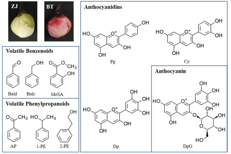 在這項研究中,為了研究揮發(fā)性和非揮發(fā)性BPs對紫色茶花的氣味和顏色的作用,在白色(ZJ品種)和紫色(BT品種)茶花瓣中測定了BP型香氣和花青素(圖1),確定了生物合成和花青素運(yùn)輸相關(guān)途徑中的基因表達(dá)譜,并分析了調(diào)節(jié)ZJ和BT之間氣味和顏色變化可能的TFs。