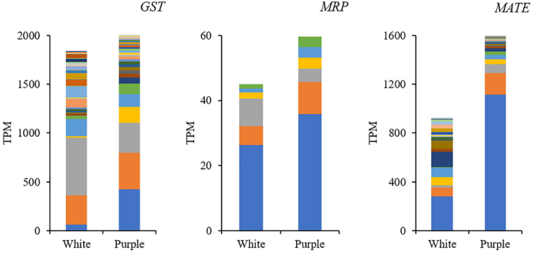 為了進(jìn)一步揭示兩個茶樹品種之間BPs的不同合成機(jī)制,檢測了上游化合物和基因(圖5)。在紫色花瓣中,3-磷酸甘油醛(GA3P)增加了2.9倍,而磷酸烯醇式丙酮酸(PEP)僅為白色花瓣的38%,這表明紫色花瓣中的碳代謝被促進(jìn),但它可能不會進(jìn)入苯丙氨酸的下游代謝。PEP的降低可能是由于高度誘導(dǎo)的3-脫氧-D-阿拉伯庚糖酸7-磷酸合成酶(DAHPS)所致。在紫色花瓣中,DAHPS基因的主要成員TEA028537的表達(dá)量高出4.6倍。芳醇脫水酶/預(yù)苯酸脫水酶(ADT)催化芳醇生成苯丙氨酸。它的主要成員TEA033282在紫色花瓣中略微升高,高出1.3倍。此外,合成的花青素在顯示顏色之前需要運(yùn)輸?shù)揭号葜?,該過程與谷胱甘肽S-轉(zhuǎn)移酶(GST)、多藥耐藥相關(guān)蛋白(MRP)以及多藥和毒素擠壓(MATE)有關(guān)。把這些顯著差異基因的表達(dá)量加起來,發(fā)現(xiàn)紫色花瓣的總表達(dá)量都較高,分別高出1.1, 1. 3和1.7倍。紫色花瓣中這三個基因的主要成員(TEA015341、TEA001531和TEA006958),表達(dá)量分別高出6.9, 1. 4,和3.9倍。