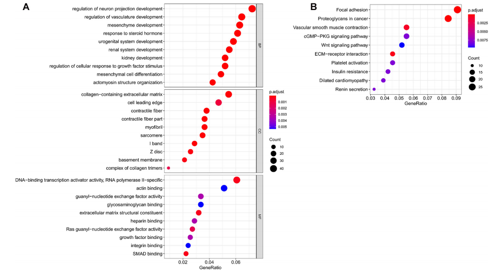 作者使用了677個共有差異mRNAs,通過GO和KEGG通路富集分析來鑒定關鍵miRNAs的潛在功能。作者在GO分析中獲得了836個結果,其中圖4A顯示了來自生物過程、細胞成分和分子功能的前10個結果。一些結果與腫瘤的發(fā)生和進展有關,包括調(diào)節(jié)細胞對生長因子刺激的反應,含膠原蛋白的細胞外基質和基底膜等。此外,從KEGG通路分析中注釋了48條信號通路,前10個結果如圖4B所示。這些通路大多數(shù)與腫瘤的發(fā)生和發(fā)展相關,包括焦點粘連、癌癥中的蛋白多糖、細胞外基質-受體相互作用和Wnt信號通路。其中粘著斑通路富集最為顯著。