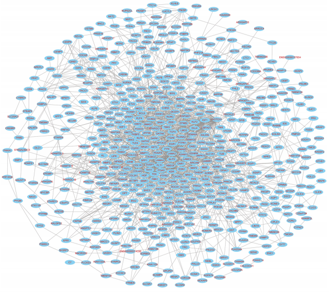 (圖5)關鍵miRNAs靶向mRNA的PPI網(wǎng)絡圖