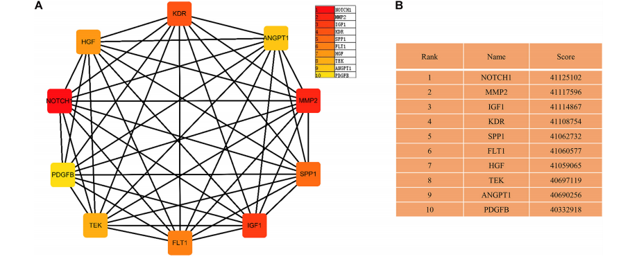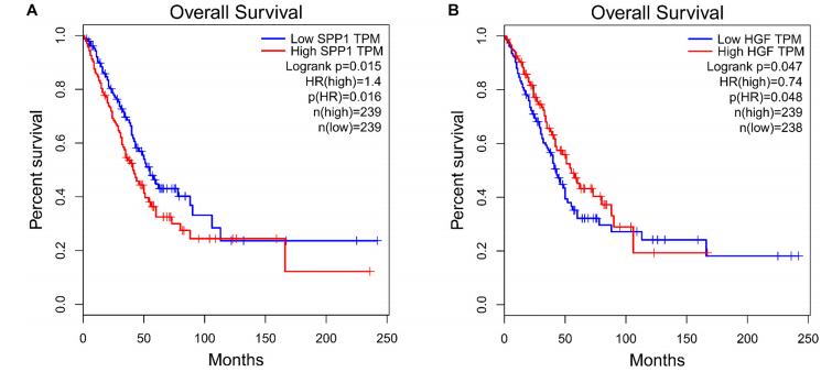 PPI網(wǎng)絡從677個共有差異mRNA中識別出597個mRNA,其中有2246條邊相互關聯(lián)(圖5)。使用cytoHubba插件MCC排名確定了前10個關鍵mRNA,包括神經(jīng)源性位點notch同源蛋白1(NOTCH1)、基質金屬蛋白酶2(MMP2)、胰島素樣生長因子1(IGF1)、激酶插入結構域受體(KDR)、分泌磷蛋白1(SPP1)、血管內(nèi)皮生長因子受體1(FLT1)、肝細胞生長因子(HGF)、血管生成素1受體(TEK),血管生成素-1基因(ANGPT1)和血小板源性生長因子(圖6)。通過生存分析的計算,作者使用GEPIA進一步驗證了這些關鍵的mRNA。在這里,只有兩個(SPP1和HGF)被鑒定為關鍵基因,并與生存相關(圖7)。生存分析顯示,在LUAD中,SPP1的表達與生存呈負相關,而HGF與生存呈正相關(圖7)。此外,SPP1和HGF均在黏附信號通路中富集。