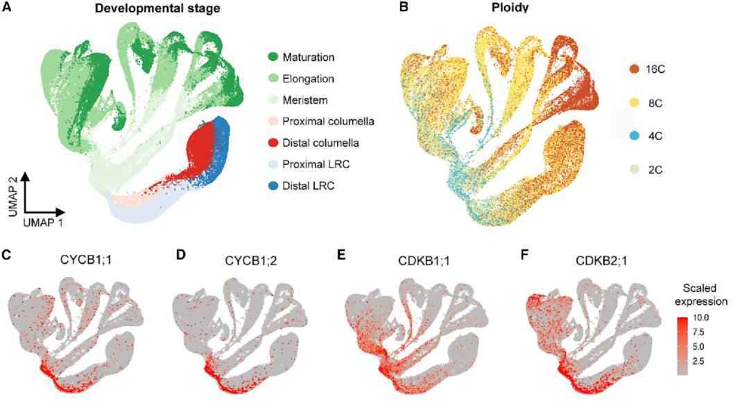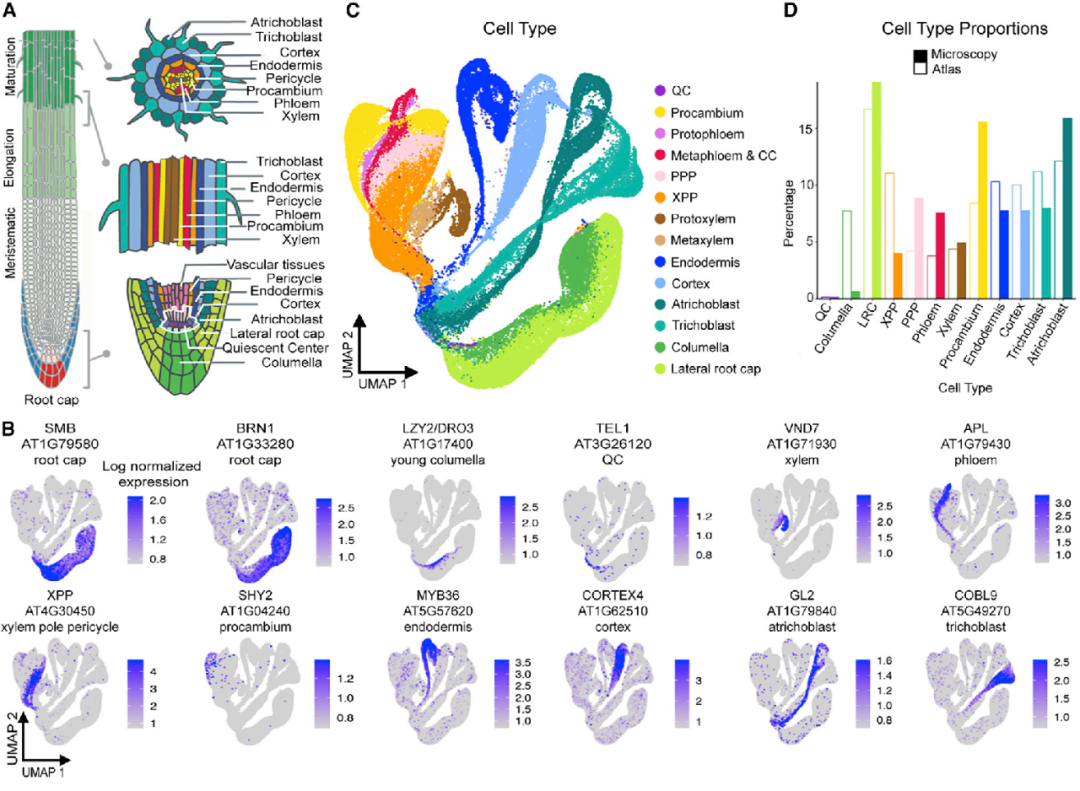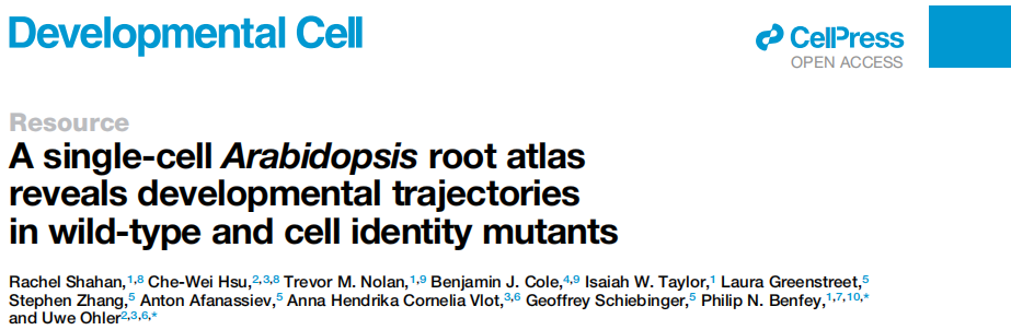 Shahan R, Hsu CW, Nolan TM, et al. A single-cell Arabidopsis?root atlas reveals developmental trajectories in wild-type and cell identity mutants.?Dev Cell. 2022 Feb 28;57(4):543-560.e9.