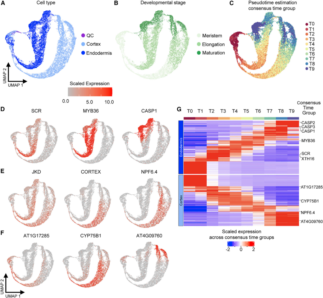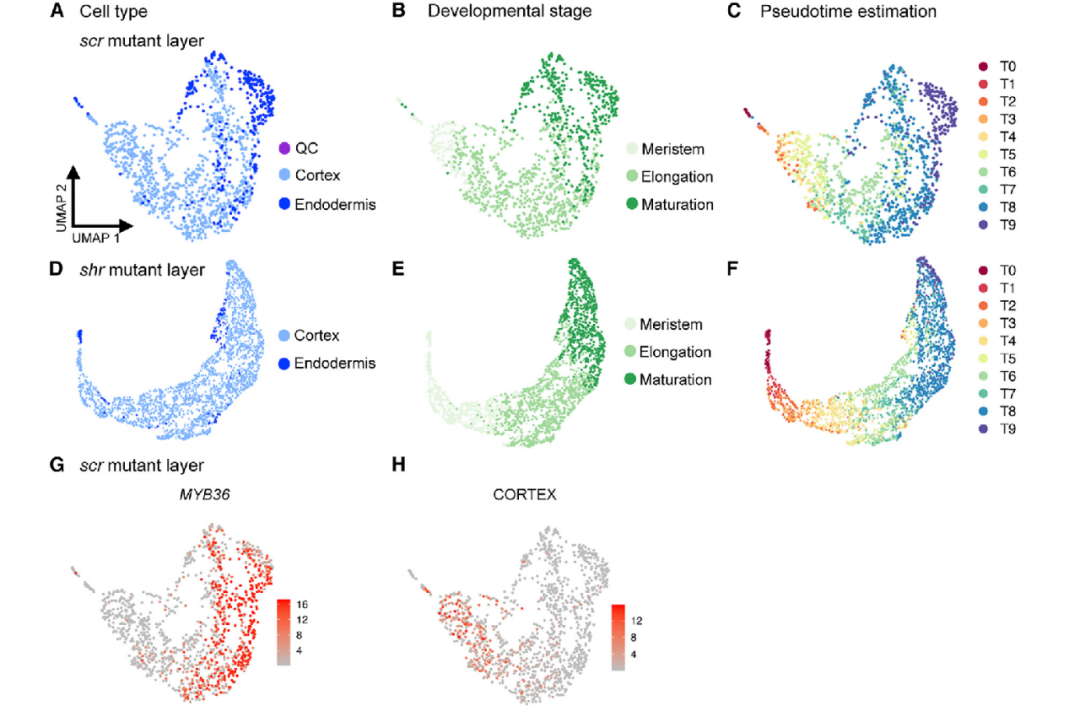 這篇文章通過對不同發(fā)育階段的擬南芥根細胞進行scRNA-seq,構(gòu)建了十萬級水平的根細胞基因時空表達圖譜,并利用理想傳輸理論(OT)推斷出了細胞系的發(fā)育軌跡。同時,通過比較scr和shr突變體的scRNA-seq數(shù)據(jù),從單細胞水平闡釋了scr突變層細胞同時具有皮層和內(nèi)皮層混合特性,并指出了其發(fā)育軌跡上的特性轉(zhuǎn)變。最后,使用內(nèi)皮層和皮層轉(zhuǎn)錄報告基因?qū)σ陨辖Y(jié)論進行了體內(nèi)驗證。