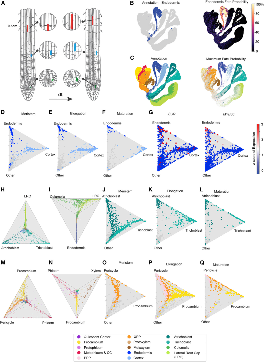 由于擬時序推理表明根細胞類型以不同的速率成熟,于是作者利用基于理想傳輸理論OT(Optimal?Transport)的StationaryOT分析方法來推斷整個圖譜的發(fā)育軌跡。研究人員發(fā)現(xiàn)它可以在很大程度上獨立于圖譜注釋和細胞系分割,來推斷細胞系的發(fā)育軌跡,反映每種細胞和組織類型分化的現(xiàn)有生物學(xué)知識。分化事件可以通過將多個命運概率以“三角圖”的形式投影到重心坐標(biāo)中來實現(xiàn)可視化。作者利用“三角圖”分別展現(xiàn)了分生區(qū)、伸長區(qū)、成熟區(qū)的內(nèi)皮層和皮層細胞的命運概率(圖4D-F)。已知內(nèi)皮層標(biāo)記基因SCARECROW?(SCR)?和MYB36的表達模式與伴隨細胞成熟而不斷增加的內(nèi)皮層命運概率相一致(圖4G)。之后按照發(fā)育區(qū)對生毛細胞、非生毛細胞(圖4J-L),中柱鞘、原形成層(圖4O-Q)也繪制“三角圖”。此外,理想傳輸理論也有助于識別發(fā)育調(diào)節(jié)因子。