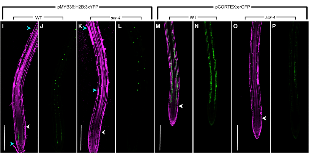 為了在體內(nèi)進一步對scRNA-seq得到的結(jié)論進行驗證,作者驗證了皮層和內(nèi)皮層標(biāo)志物的空間表達模式在scr突變層是否會發(fā)生改變。在WT中,內(nèi)皮層標(biāo)志基因MYB36和皮層轉(zhuǎn)錄報告基因AT1G09750?(CORTEX)在它們各自類型的伸長區(qū)表達,MYB36在分生區(qū)的內(nèi)皮層也表達。但scr突變體中,MYB36轉(zhuǎn)錄報告基因的表達僅在晚期延伸區(qū)和成熟區(qū)可見,皮層轉(zhuǎn)錄報告基因在延伸區(qū)和成熟區(qū)都有所減少(圖6-2)。以上結(jié)果都與scRNA-seq分析結(jié)果一致。