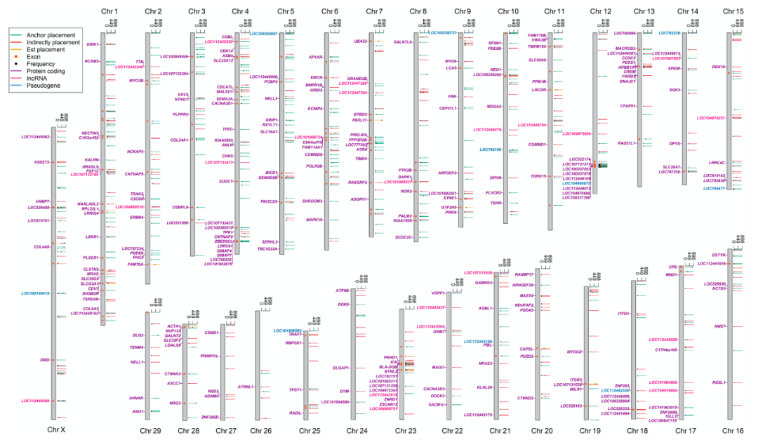 為解決以上問題,該文章通過開發(fā)新的基因組分析流程,對來自世界57個品種898頭牛的基因組序列進行組裝和SV檢測;發(fā)現(xiàn)了83Mb的牛基因組未知序列,相當于目前參考基因組序列總長度的3.1%,并且從中鑒定出大量未知外顯子序列,最后綜合三種策略成功將1007條contig放置在現(xiàn)有參考基因組上,這些序列可能通過外顯子破壞、外顯子添加等方式影響了279個基因的序列結(jié)構(gòu)。