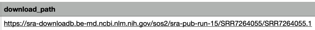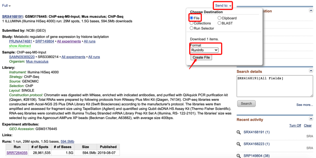 然后點(diǎn)擊最下方SRA編號(hào),進(jìn)入下面的頁(yè)面這里面包含了這個(gè)樣本的基本信息,包括測(cè)序平臺(tái)、文庫(kù)類(lèi)型、數(shù)據(jù)量等基本信息,然后點(diǎn)擊頁(yè)面右上方的Send to按鈕,選擇File,F(xiàn)ormat選擇RunInfo,然后點(diǎn)擊Creat file下載一個(gè)csv文件,打開(kāi)文件,可以看到一個(gè)下載鏈接