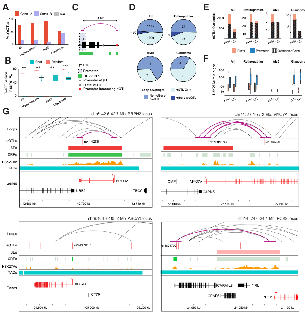 eQTL將特定的遺傳變異與目標(biāo)基因表達的變化聯(lián)系起來(下文稱為eGene),為了識別可能與視網(wǎng)膜基因調(diào)節(jié)相關(guān)的eQTL,結(jié)合14,859個視網(wǎng)膜eQTLs,發(fā)現(xiàn)大多數(shù)視網(wǎng)膜eQTL都存在于活躍的染色質(zhì)中,并駐留在同一個TAD中,這為解釋基因變體對eGene的影響提供了直接機制。此外,評估了變異與其eGene的啟動子區(qū)域(距離TSS±2.5kb)之間的物理距離,能夠區(qū)分啟動子eQTL、遠端eQTL和與啟動子相互作用的遠端eQTL。分別確定了2,410個CRE(CRE-eQTL)和880個SE(SE-eQTL)特殊的eQTL,其中58.5%的CRE-eQTL和69.3%的SE-eQTL也與相關(guān)的eGene相交??傮w而言,大多數(shù)eQTL在物理上與eGene或其啟動子重疊或者通過染色質(zhì)loops互作接近各自的eGene。