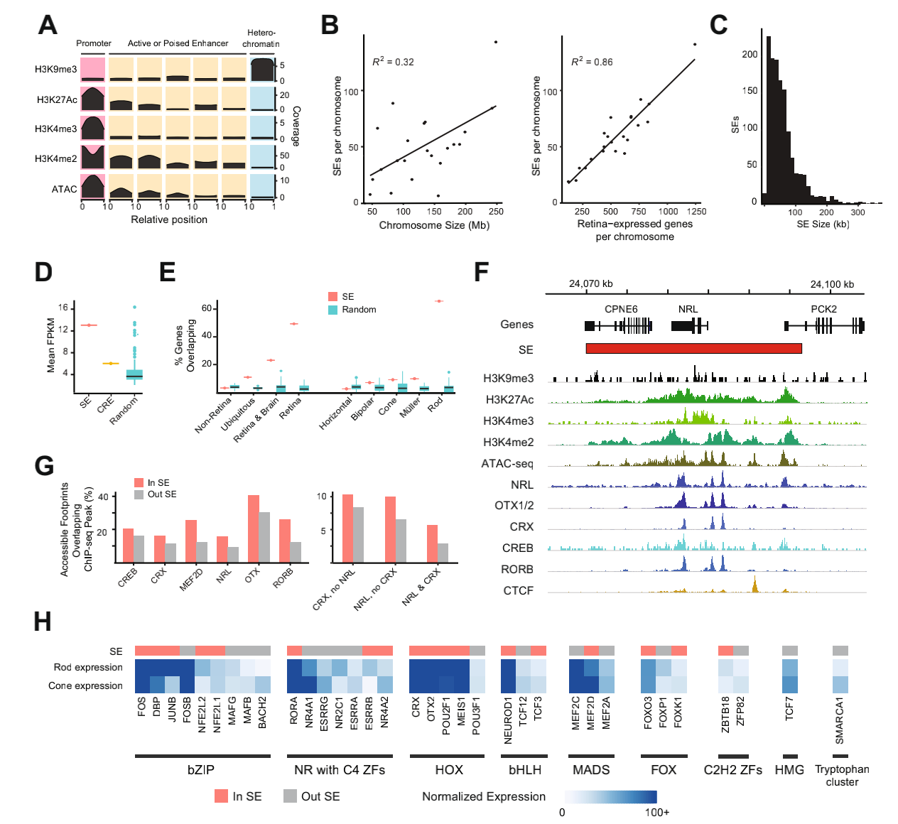 利用H3K27Ac蛋白標(biāo)記互作在視網(wǎng)膜順式調(diào)控元件啟動子和活性或穩(wěn)定增強子區(qū)域鑒定了1325個超級增強子(SEs),發(fā)現(xiàn)視網(wǎng)膜表達基因的數(shù)量與每個染色體的SE數(shù)量之間存在高度相關(guān)性。SE與轉(zhuǎn)錄組測序數(shù)據(jù)集結(jié)合分析表明,與CRE相比,SE重疊的基因的平均表達量高2.17倍,并且比100組隨機SE大小的位點高2.89倍,視網(wǎng)膜中關(guān)鍵的光感受器特異性基因NRL主要在活性組蛋白標(biāo)記和染色質(zhì)開放區(qū)域的大型SE中富集,與CRE或隨機區(qū)域相比,TF結(jié)合位點主要存在于SE中,其中編碼許多具有豐富結(jié)合基序TF的基因也與SE重疊,這表明它們在維持視網(wǎng)膜穩(wěn)態(tài)方面的潛在作用。