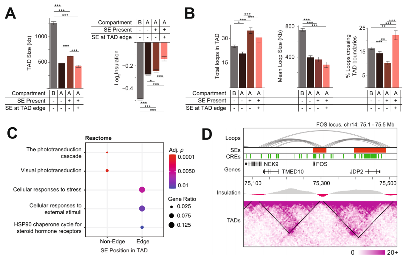 SE靶向基因功能研究,即TSS與SE重疊或相互作用的基因,發(fā)現(xiàn)SE處在邊緣的TAD中都是富含應(yīng)激反應(yīng)基因,而視網(wǎng)膜基因主要在SE處于中心的TAD中富集,其中應(yīng)激反應(yīng)FOS重疊的SE位于TAD的邊緣,該TAD可能會受到超出自身TAD邊界的區(qū)域變化的影響。