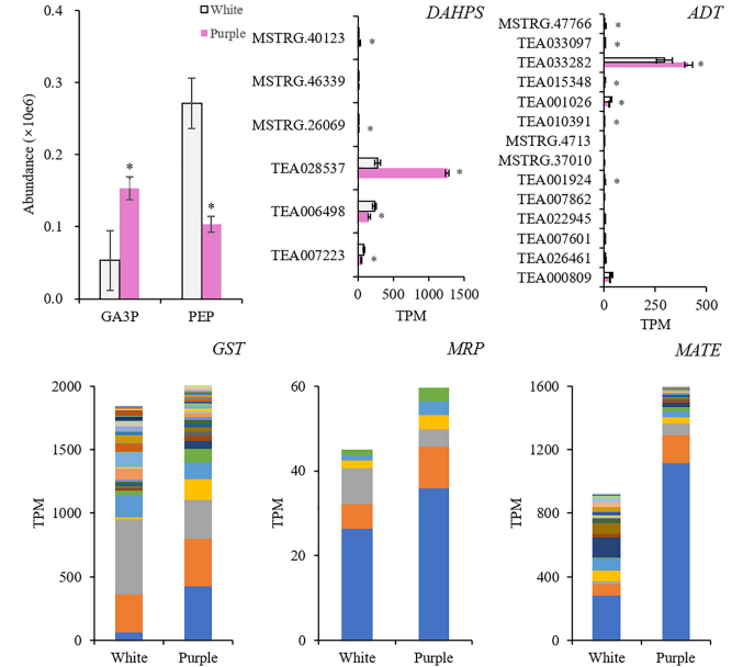 選擇與AP和DpG高度相關(guān)的轉(zhuǎn)錄因子(TFs),研究它們與差異表達的結(jié)構(gòu)基因的相關(guān)性。結(jié)果顯示MYB、AP2/ERF、bZIP、TCP、GATA等基因顯著表達,并專注于Phe上游合成基因的調(diào)控(DAHPS;和AP(苯乙醛還原酶、短鏈脫氫酶/還原酶)、Dp(F3H;F3?5?H)和DpG(BZ1)的合成,但抑制黃酮(黃酮醇合酶)和兒茶素(白花青素還原酶)的形成。這些結(jié)果發(fā)現(xiàn)了紫茶樹中揮發(fā)性BPs的促進作用,擴展了我們對BPs型顏色與香氣關(guān)系的理解。