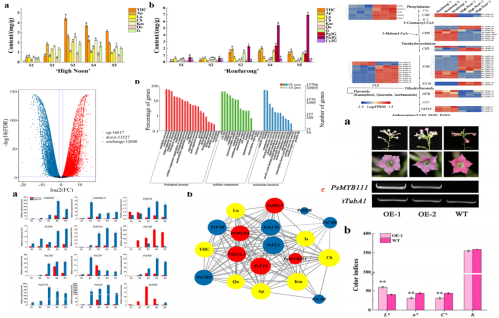 亞細胞定位分析與轉(zhuǎn)基因?qū)嶒灲Y(jié)果進一步驗證了上述基因的關(guān)鍵作用:亞細胞定位分析顯示PsMYB111定位于細胞核,表明PsMYB111可能在細胞核中發(fā)揮TF的作用。PsMYB111在煙草中的過表達使其花顏色由玫瑰紅變?yōu)闇\粉色。轉(zhuǎn)基因煙草株系中Km、Qu等黃酮醇含量顯著增加,而Pg3G、Pn3G等花青素含量顯著降低,證實了其在黃色牡丹花著色中的作用。此外,在GhMYB1a過表達的轉(zhuǎn)基因煙草株系中,NtCHS、NtF3H和NtFLS的表達顯著上調(diào),GhMYB1a顯著激活了非洲菊GhDFR和GhMYB10的NtCHS和NtFLS啟動子。同樣,PsMYB111對PsCHS和PsFLS啟動子,尤其是PsFLS有顯著的激活作用。