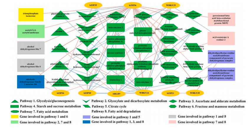 該研究對中國7個地區(qū)突尼斯石榴的代謝組和轉(zhuǎn)錄組、風味相關(guān)屬性和揮發(fā)性化合物進行了研究。7個不同種植區(qū)的石榴,糖、有機酸和維生素c含量存在顯著差異。所有樣品共鑒定了40種揮發(fā)性化合物,其中13種揮發(fā)性化合物。所有樣品中有4種化合物含量較高,包括1-己醇、(Z)-3-己烯醇、α-松果醇和2,4-二叔丁基苯酚,是影響石榴香氣品質(zhì)的主要貢獻因素。所有樣品的5個差異積累代謝物,包括棕櫚酸、辛酸、月桂酸、癸酸和肉豆蔻酸,在所有樣品的脂肪酸生物合成中均顯著富集。WGCNA分析結(jié)果表明42個候選風味相關(guān)差異表達基因和9個轉(zhuǎn)錄因子主要位于3個關(guān)鍵模塊中。己烷酸是一種重要的代謝物,與38個差異表達基因顯著相關(guān)。本研究構(gòu)建了復雜的調(diào)控網(wǎng)絡(luò),以確定調(diào)控石榴中揮發(fā)性化合物代謝的結(jié)構(gòu)基因和轉(zhuǎn)錄因子,發(fā)現(xiàn)bZIP56、bZIP56、bZIP20、WRKY24和bHLH9在石榴果皮的風味代謝調(diào)控中起重要作用。