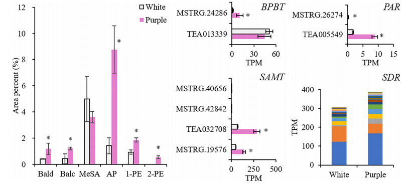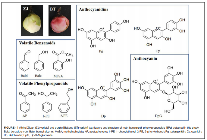 山茶花的花通常是白色的,葉片是紫色的,研究發(fā)現(xiàn)了一種特殊的品種,葉子和花都是紫色的,而研究者通常關(guān)注顏色形成的機制,而忽略了香氣的變化。紫茶樹含有更多的花青素,屬于黃酮類化合物。同時,由莽草酸途徑衍生的苯丙氨酸(Phe)是黃酮類化合物和揮發(fā)性苯類苯丙素(BPs)的前體。因此,目前尚不清楚BP的香氣是否因紫色的出現(xiàn)而減弱。