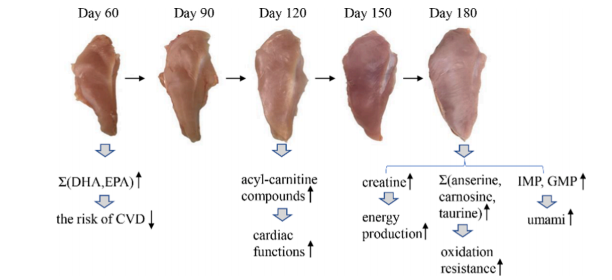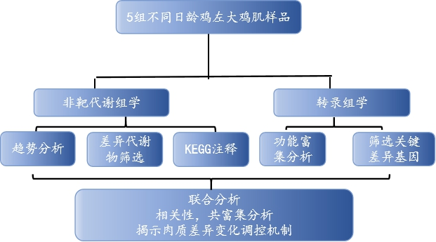 雞胸肉含有不飽和脂肪酸和較低的脂肪、鈉和膽固醇,是大家最喜歡肉類之一。近年來(lái),隨著人們對(duì)食品營(yíng)養(yǎng)價(jià)值和自身健康的重視,研究者們開(kāi)始致力于如何提高肉類質(zhì)量的研究,而生長(zhǎng)時(shí)期是影響雞肉質(zhì)量的重要因素,但不同時(shí)期哪些特定代謝物積累是影響雞肉品質(zhì)的關(guān)鍵還不清楚。本研究使用代謝組和轉(zhuǎn)錄組技術(shù),確定了特定代謝物積累的關(guān)鍵基因,有助于了解肉類質(zhì)量發(fā)展下的生物過(guò)程,并探索特定代謝物積累的有價(jià)值的生物標(biāo)志物。