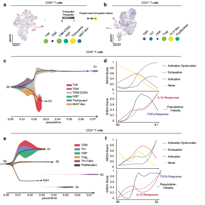 該團隊對?8?名診斷為新發(fā)膠質母細胞瘤的患者腫瘤組織樣本進行了單細胞測序和數(shù)據(jù)分析,發(fā)現(xiàn)“S1”狀態(tài)與?T?細胞耗竭/功能障礙標志物(HAVCR2、CTLA4?和?PDCD1)的表達增加,為了確定與?T?細胞耗竭相關的轉錄途徑,進行了通路信號傳導推斷,揭?示了?T?細胞耗竭與?IL-10?以及部分?TGF??反應之間存在著相關性。