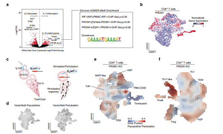 該團隊通過擾動模擬,用IL-10刺激所產(chǎn)生scRNA-seq數(shù)據(jù)集富集分析推斷常見轉錄因子結合位點,發(fā)現(xiàn)ChiP-seq數(shù)據(jù)中基因BLIMP-1和IRF1峰之間密切重疊,IRF1和PRDM1/14結合位點的顯著富集,提出了“IL10-STAT3-BLIMP-1信號軸可能是腫瘤相關T細胞耗竭的潛在驅動因素”的假設。為了進一步驗證猜想,作者對PRDM1進行了計算機擾動模擬驗證,發(fā)現(xiàn)膠質瘤母細胞瘤微環(huán)境中髓樣細胞分泌IL-10驅動誘發(fā)T?細胞耗竭。