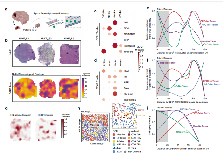 為了確定?T?細胞簇的空間位置信息,以及與特定腫瘤狀態(tài)共定位信息,作者進行了空間分辨轉錄組RNA測序(stRNAseq)。該團隊收集3名原發(fā)性GBM IDH1/2 Wt患者組織樣本,數(shù)據(jù)集總共包含2352個測序點,每個點的中位數(shù)為8個細胞(范圍:每個spot點捕獲4~22個細胞)。作者通過NMF回歸和Moran統(tǒng)計分析,發(fā)現(xiàn)CD8+T細胞簇與GBM亞型相關聯(lián),腫瘤區(qū)域富集為間充質樣腫瘤(MES樣),星形膠質細胞樣(AC樣)轉錄特征與活化的CD8+效應子、CD8+T耗盡簇共定位。