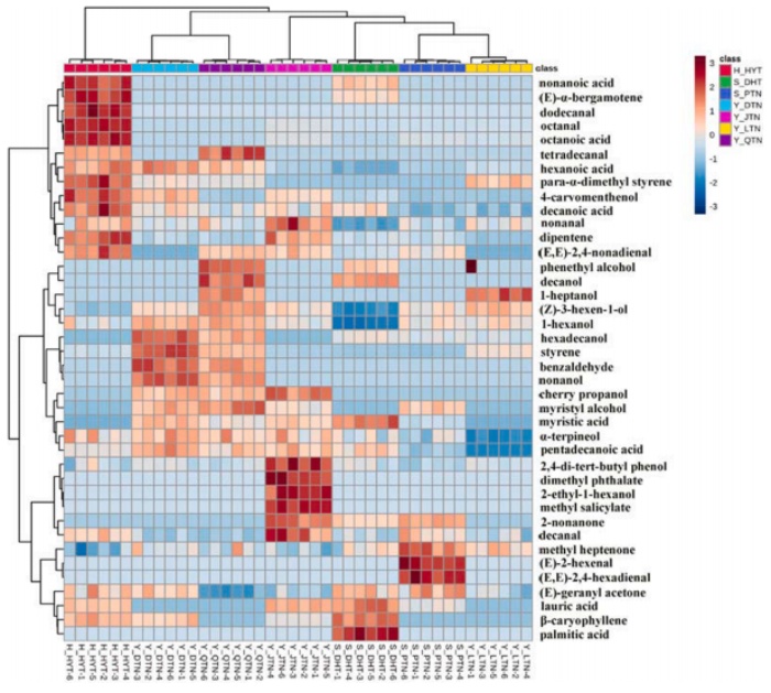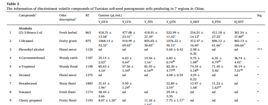 7個產區(qū)突尼斯軟籽石榴揮發(fā)性化合物的熱圖:風味譜、糖、有機酸和維生素c含量存在顯著差異。所有石榴花粒中共鑒定出40種揮發(fā)性化合物,其中醇、醛、酸和二戊烯是影響石榴香氣品質主要因素。