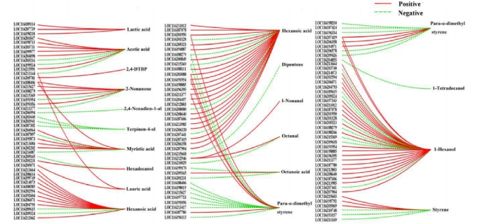 相關性網絡圖:己酸和1-己醇是石榴果實中的關鍵揮發(fā)性化合物,分別與38個和31個DEGs顯著相關,例如Para-α-二甲基苯乙烯、2-非丙酮、肉豆蔻酸、苯乙烯和乙酸與不少于5個DGE具有顯著的高相關性。結果表明,植物的次級代謝途徑不僅僅是相應途徑中酶與底物反應的結果,還受到其他途徑中基因編碼蛋白與代謝物相互作用的影響。