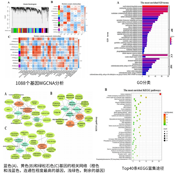 GO和KEGG富集;1808基因主要富集于分子功能的“裂解酶活性”,細胞成分的“葉綠體基質”,生物過程的“小分子生物合成過程”。鑒定了40條顯著富集的KEGG途徑,其中碳代謝生物合成的DGE數量最多。與其他次生代謝產物相關的途徑也被富集,包括淀粉和蔗糖代謝、糖酵解/糖異生等,這些富集的基因大部分屬于黃色、綠松石色和藍色模塊。這也表明,這些模塊中的基因的功能與KEGG富集分析相一致,而KEGG富集分析主要與初級和次生代謝產物的合成和代謝有關。
