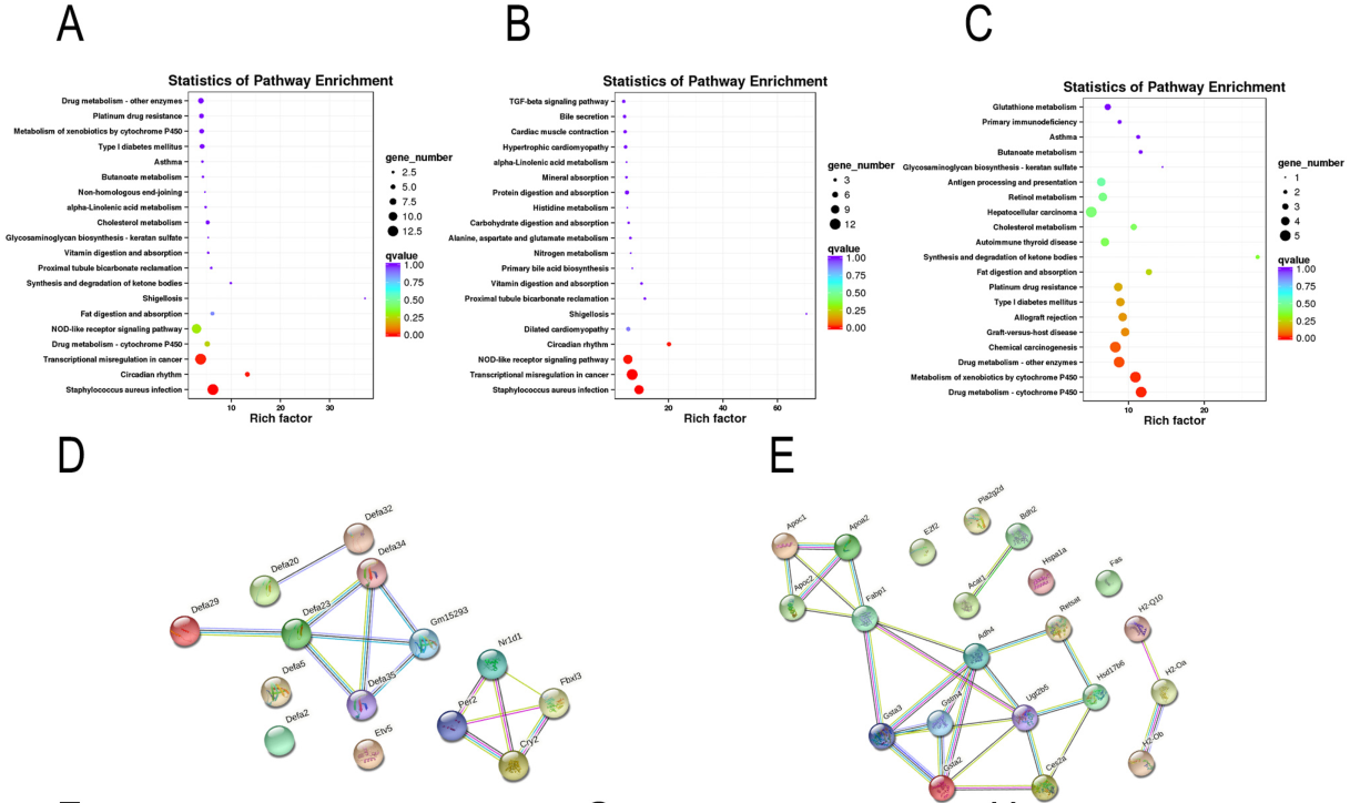 對(duì)共有DEG進(jìn)行功能富集分析,發(fā)現(xiàn)顯著富集的通路主要與宿主先天防御和脂質(zhì)代謝相關(guān)(圖3A);在去除功能未鑒定的基因或lncRNA后,獲得140個(gè)上調(diào)和92個(gè)下調(diào)的DEG也進(jìn)行功能富集分析(圖3B, 3C);然后,對(duì)top20通路的DEG進(jìn)行PPI調(diào)控網(wǎng)絡(luò)分析(圖3 D, 3E),結(jié)果顯示,EA主要上調(diào)的通路包括α防御素基因在內(nèi)的NOD樣受體信號(hào)通路(圖3 D),下調(diào)的通路脂質(zhì)代謝(包括脂質(zhì)消化和吸收途徑),以及免疫應(yīng)答相關(guān)通路(谷胱甘肽s-轉(zhuǎn)移酶和MHC II類相關(guān)基因)(圖3E)?;虮磉_(dá)直方圖顯示EA干預(yù)恢復(fù)大量異常表達(dá)的DEG,與腸粘膜免疫相關(guān)的DEG,如α防御素基因,可以通過EA顯著恢復(fù)(圖3F);與免疫反應(yīng)相關(guān)的H2-Ob和H2-OA僅在空腸區(qū)域下調(diào)(圖3G, 3H);EA干預(yù)恢復(fù)了fabp1、pla2g2d和acat1的表達(dá)水平,主要負(fù)責(zé)脂肪消化和吸收(圖3I);最后,EA干預(yù)通過下調(diào)apoc1、apoa2和apoc2以及上調(diào)npc1來調(diào)節(jié)膽固醇代謝(圖3J-O)。