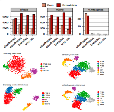 主要結(jié)果:a.?snRNA-seq增加內(nèi)含子序列分析可以達(dá)到scRNA-seq一致的靈敏度