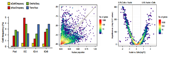將4種方法的數(shù)據(jù)整合分析,共鑒定了13個細(xì)胞簇,包括足細(xì)胞,內(nèi)皮細(xì)胞和腎小球膜細(xì)胞;3種snRNA-seq 檢測足細(xì)胞,內(nèi)皮細(xì)胞和閏細(xì)胞的靈敏度更高;但是scRNA-seq未檢測到任何足細(xì)胞。差異基因表達(dá)分析顯示,?71.4%?基因在細(xì)胞和細(xì)胞核中都被檢測到;在檢測到的基因中,僅僅?5.0%?在細(xì)胞中的表達(dá)量高于細(xì)胞核,6.4%的基因在細(xì)胞核中的表達(dá)量高于細(xì)胞(fold change>1.5,?P value <0.05)(圖3-2);scRNA-seq高表達(dá)基因包括線粒體、核糖體基因和熱休克途徑中的基因;snRNA-seq高表達(dá)基因包括溶質(zhì)載體、轉(zhuǎn)錄因子和Non-coding?RNA基因。