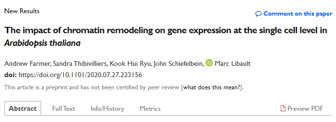 [5]Andrew Farmer1, Sandra Thibivilliers , Kook Hui Ryu,??et al.The impact of chromatin remodeling on gene expression at the single cell level in Arabidopsis thaliana.bioRxiv preprint,doi: https://doi.org/10.1101/2020.07.27.223156;2020.07.28