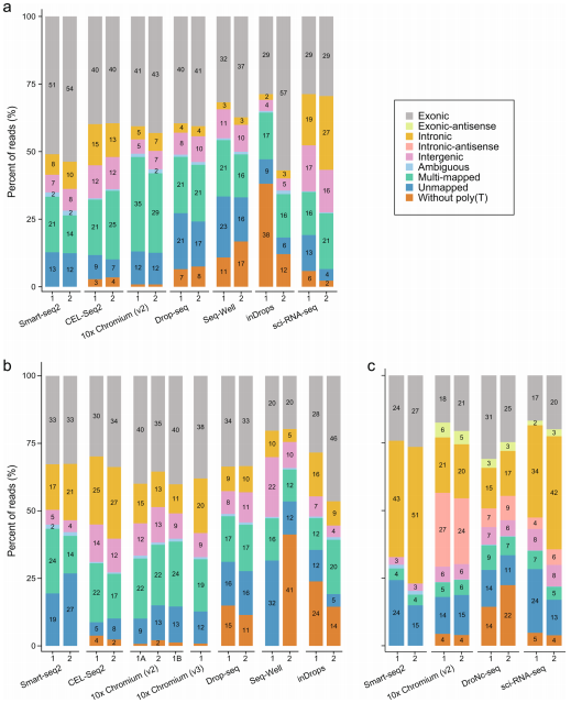 b.?reads結(jié)構(gòu)和比對到基因組的信息顯示不同方法具有效率差異結(jié)果顯示,不同的方法在預(yù)期的位置沒有Poly(T)reads比例明顯不同;外顯子、內(nèi)含子、基因間、重疊的差異基因、多重比對以及無法比對的reads不同方法間基本一致;但是細(xì)胞核中內(nèi)含子reads與外顯子reads的比率明顯高于細(xì)胞,因?yàn)榧?xì)胞核中有較高比例未剪切的轉(zhuǎn)錄本(圖2-2)。
