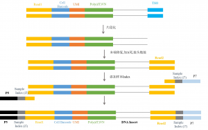 接下來進(jìn)入單細(xì)胞測(cè)序的第三環(huán)節(jié)–文庫構(gòu)建。文庫構(gòu)建可分為三個(gè)部分:DNA片段化/末端修復(fù)/添加A尾、接頭連接和Index PCR(PCR富集)。